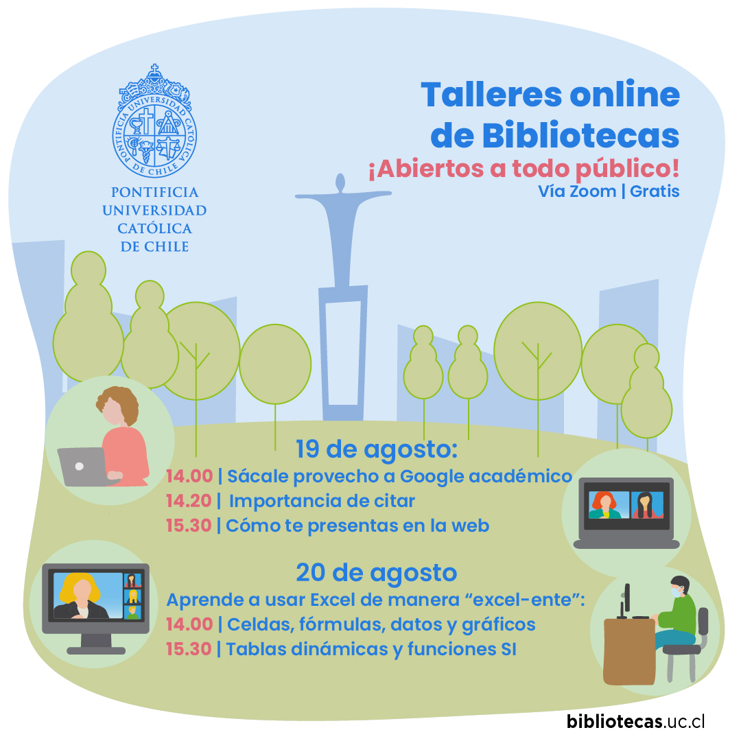 Con el objetivo de apoyar el aprendizaje y la investigación, especialmente en el actual contexto digital, Bibliotecas UC realiza una nueva jornada de talleres abiertos impartidos por profesionales especializados en búsqueda y recursos de información. Las sesiones son abiertas a todo público, gratuitas y se realizarán de manera online, a través de la plataforma Zoom.