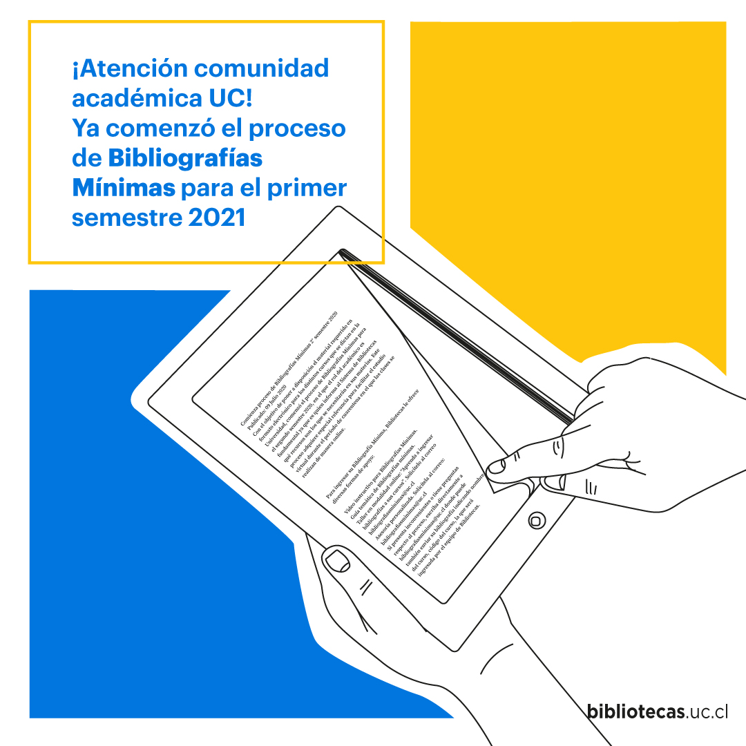 Con el objetivo de poner a disposición el material requerido en formato electrónico para los distintos cursos que se dictan en la Universidad, continúa -hasta el 05 de marzo- el proceso de Bibliografías Mínimas para el primer semestre 2021, en el que el rol del académico es fundamental ya que es quien informa al Sistema de Bibliotecas qué recursos son los que se necesitarán en sus materias. Este proceso adquiere especial relevancia para facilitar el estudio virtual durante el período de cuarentena en el que las clases se realizan de manera online.