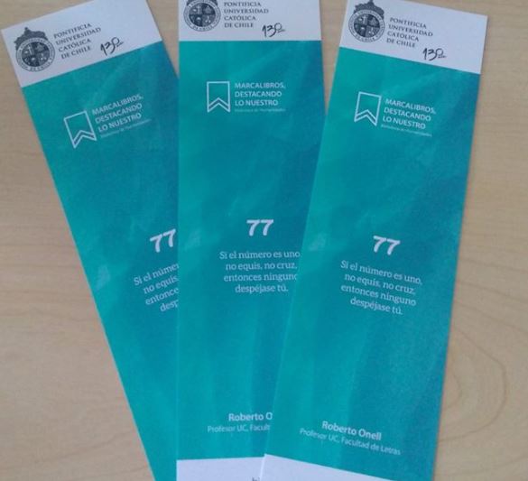 ¿Qué dirían si les contamos que este artículo, además de separar páginas, alberga textos inéditos de la Comunidad UC? La respuesta es fácil, tendría aún más valor. Y eso es lo que hizo Biblioteca de Humanidades con su proyecto: “Marcadores, destacando lo nuestro” que busca difundir obras literarias de académicos, funcionarios y estudiantes de la Pontificia Universidad Católica de Chile a través de una colección de marcalibros que será repartida de forma periódica, y cuya primera entrega ya está disponible en los mesones del espacio.